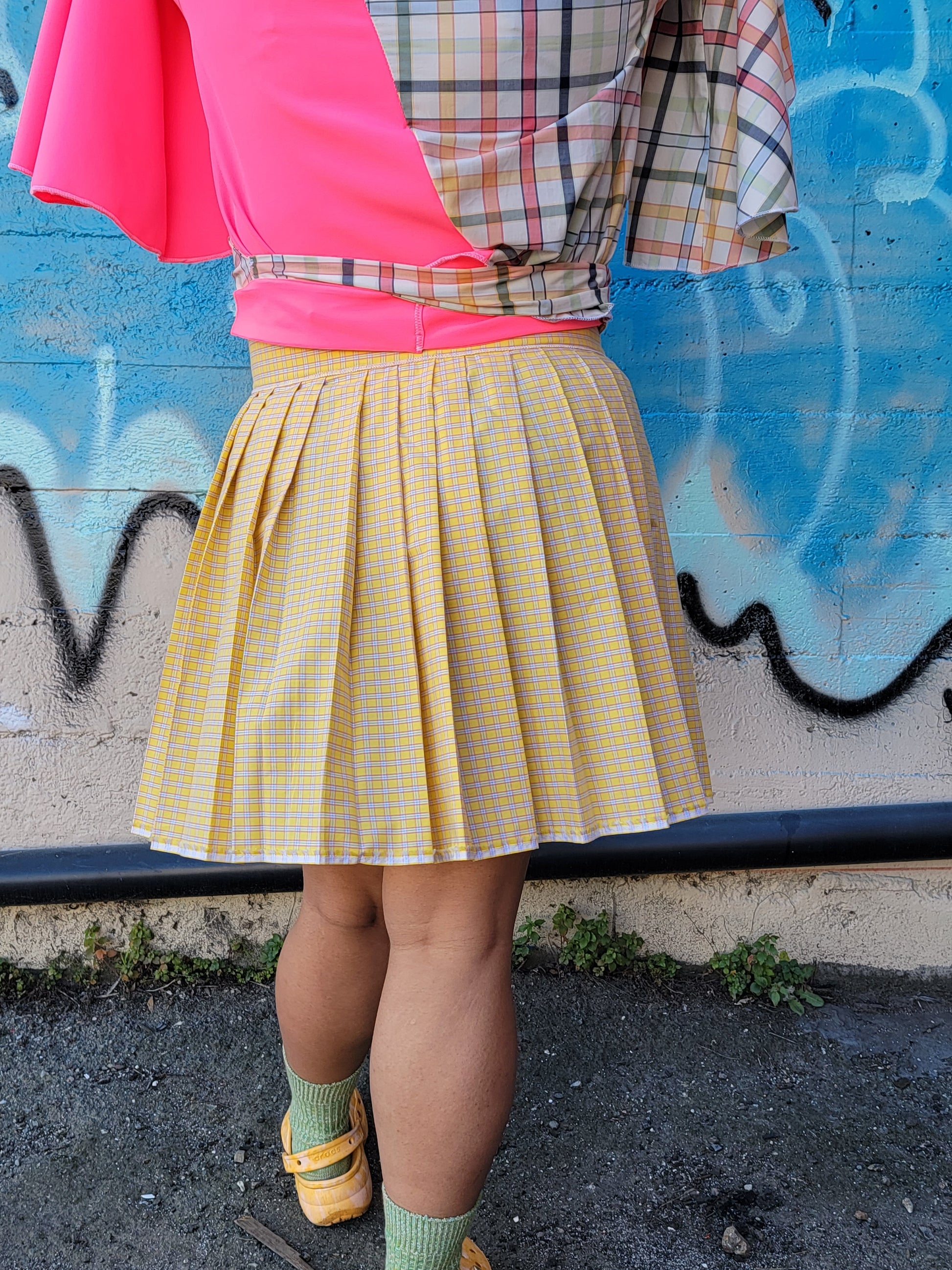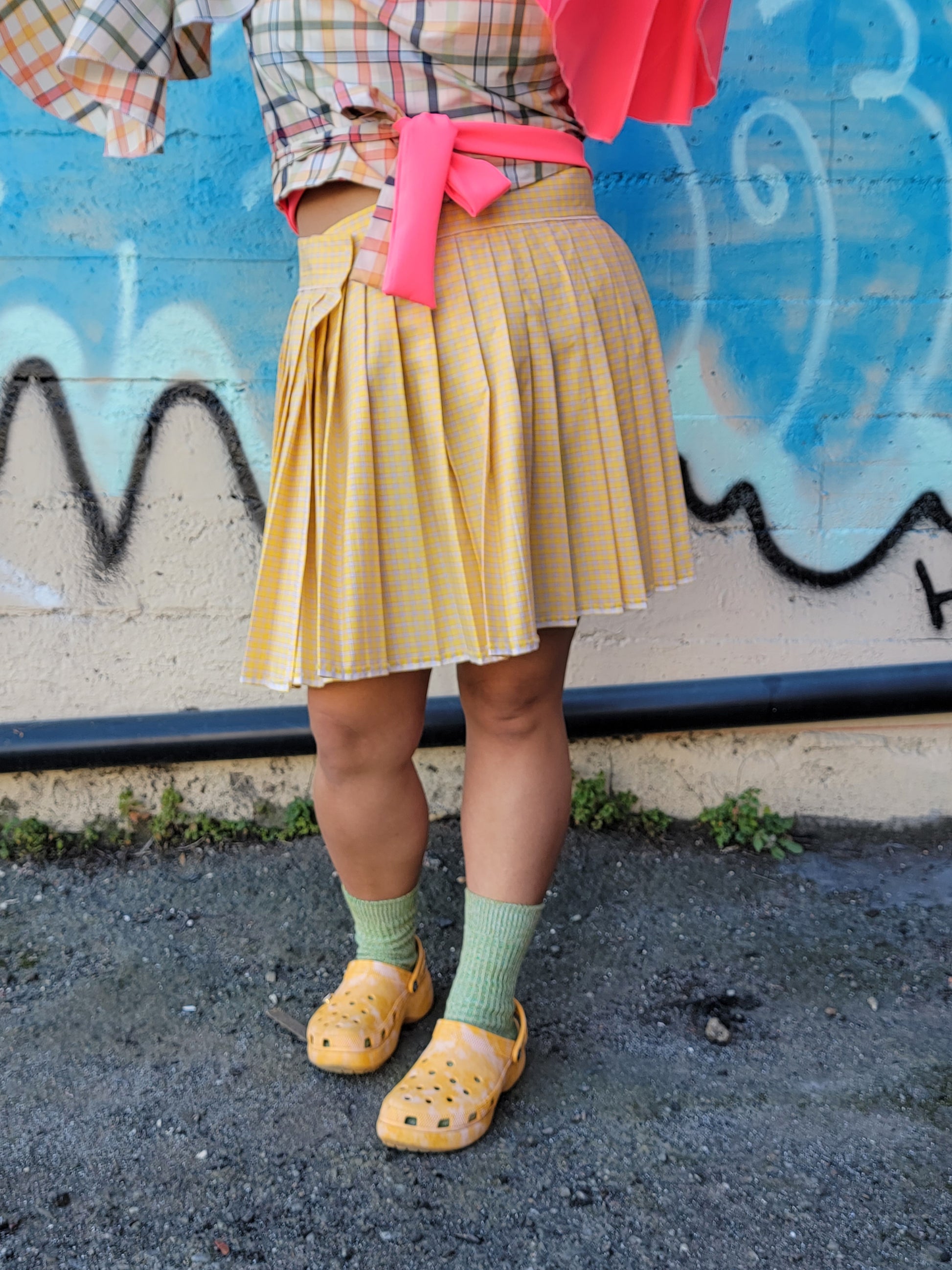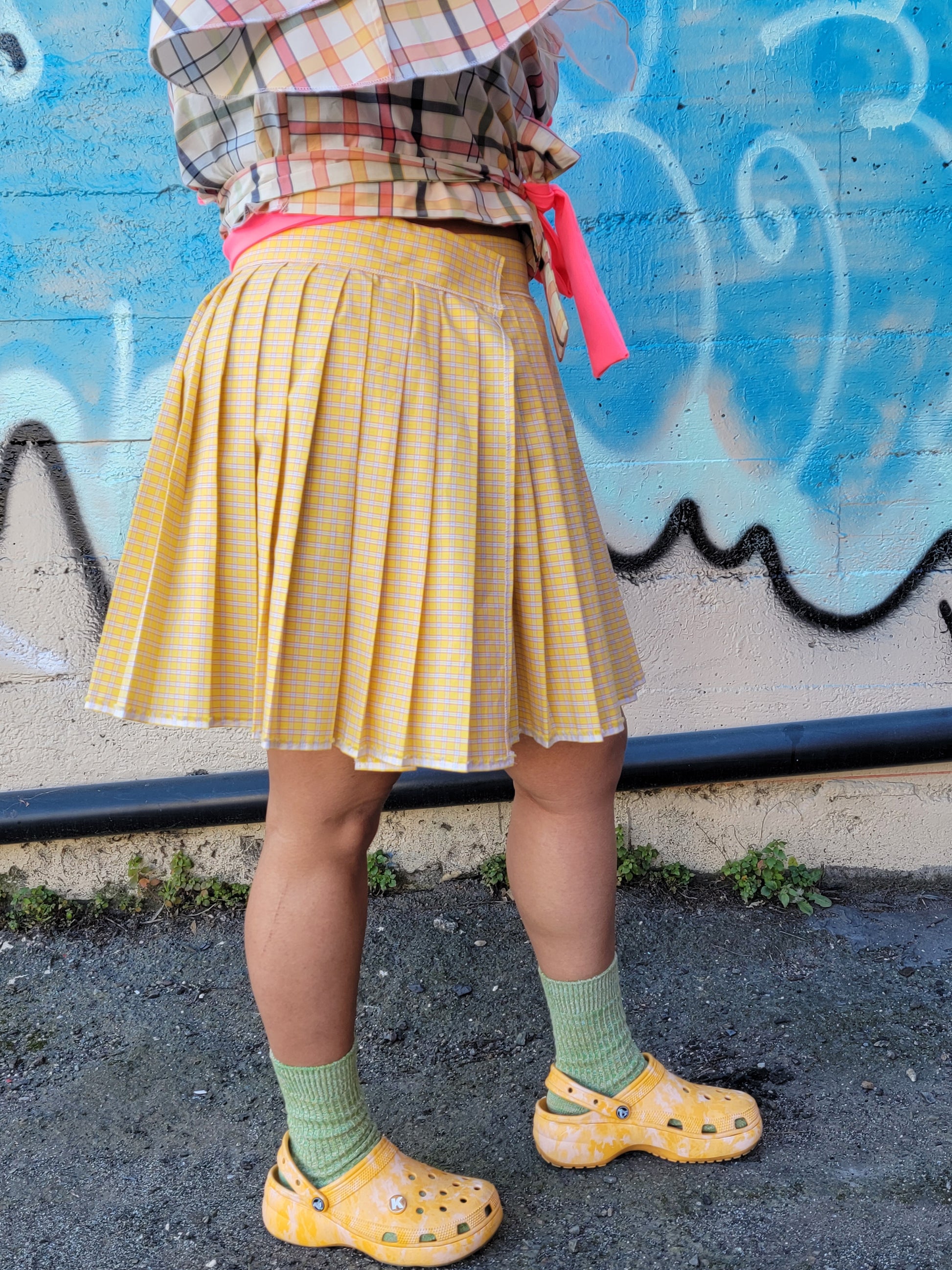 yellow plaid pleated skirt with velcro at the waist